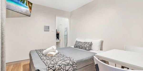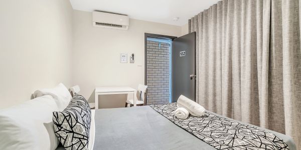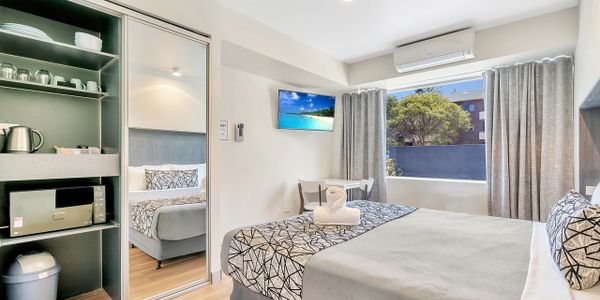 The room is equipped with a wardrobe a dining setting for two and a King Bed from Sleepmaker