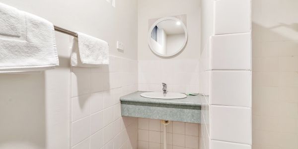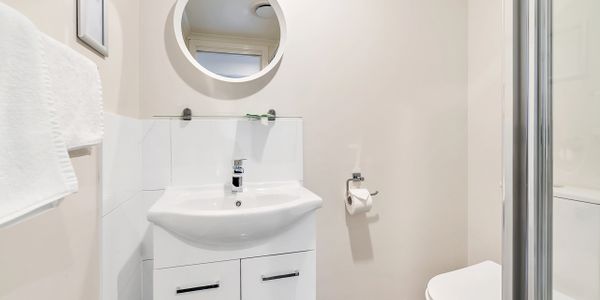 The bathrooms are fresh and clean with a shower toilet and vanity.
