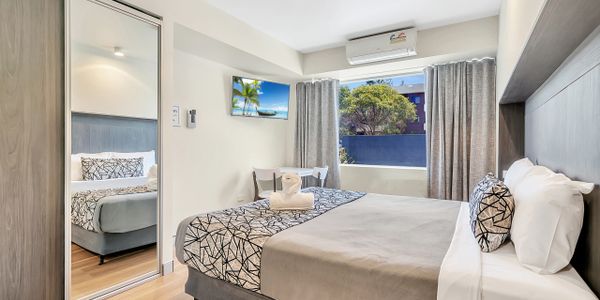 A Queen Bed including a dining setting for 2 Air Con and LED TV
